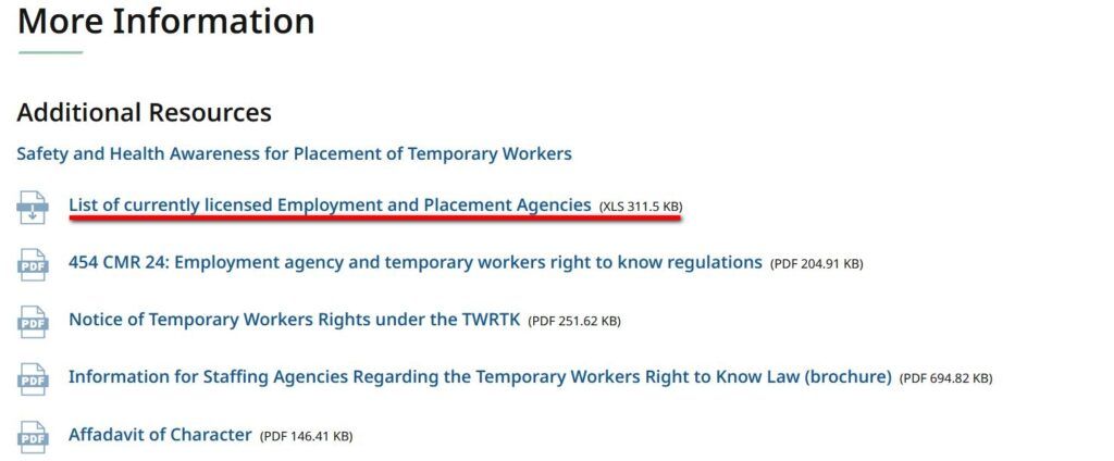 2. Пролистайте страницу вниз до заголовка “Additional Resources“. Вы увидите список документов для скачивания. Выберите документ “List of currently licensed Employment and Placement Agencies“, нажмите на него и скачайте файл в формате Excel.