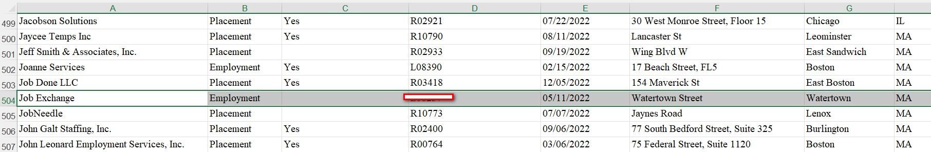 3. Откройте скачанный файл. В столбце “А” поиском найдите “Job Exchange” и ознакомьтесь с записью о нашей компании в реестре с указанием номера лицензии, срока действия и адреса компании.